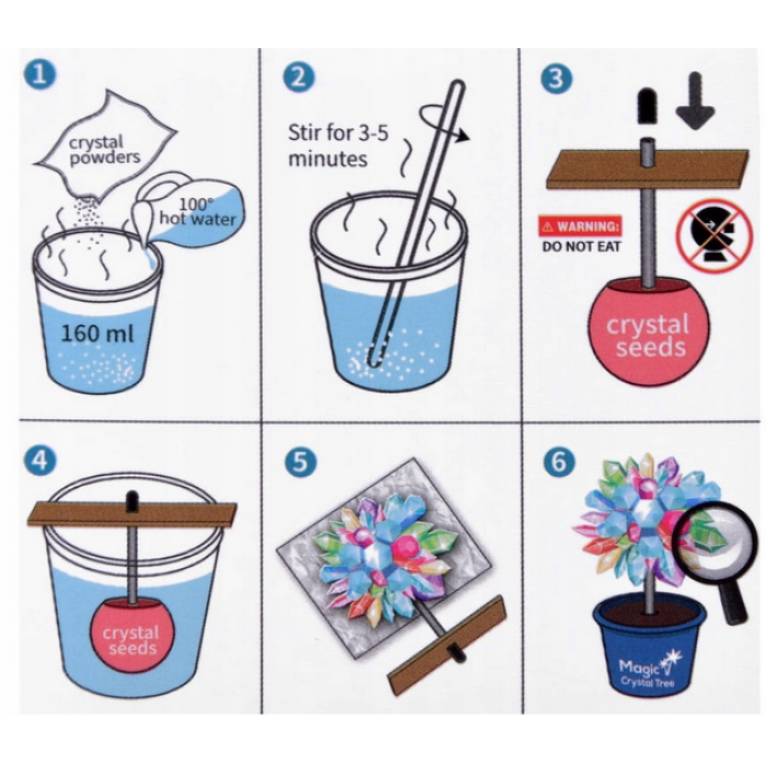 Atraskite tikrą gamtos stebuklą! Šis kūrybinis kristalų auginimo rinkinys leis vaikams atlikti savo pirmąjį mokslinį eksperimentą ir užauginti įspūdingą baltą kristalą, kuris taps rankų darbo „Laimės medžiu“. Tai ne tik pramoga, bet ir puiki edukacinė veikla, lavinanti susikaupimą, atidumą bei kantrybę – juk kristalo augimas gali užtrukti iki savaitės!