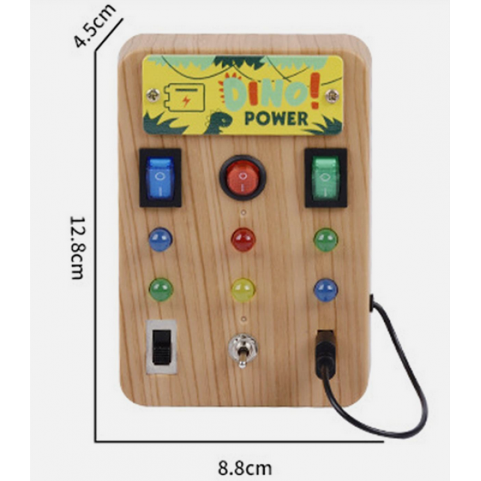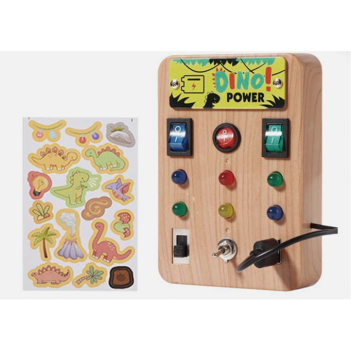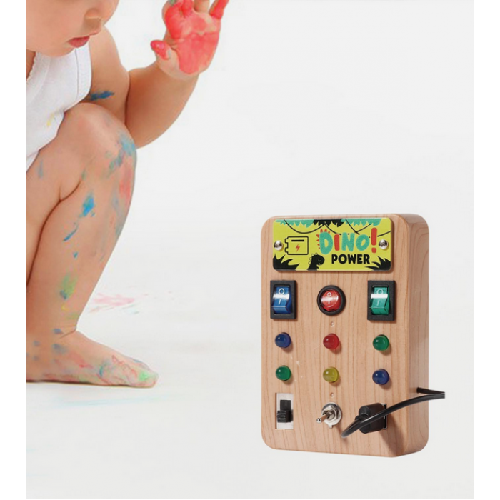 Montessori užimtumo lenta lavina smulkiąją motoriką, loginį mąstymą, dėmesio sutelkimą. Ji sukurta mažiems vaikams, kurie domisi jungikliais, nes jungiant juos, vaikas uždega arba užgesina spalvotą lemputę.  Lentoje yra 6 skirtingi jungikliai, kurių kiekvienas įjungia LED lemputę. Lenta puiki priemonė, kuri gali padėti pažinti įvairias spalvas ir dydžius, lavinant motorinius įgūdžius. Lenta kompaktško dydžio, tinkama žaisti tiek namie, tiek keliaujant, ypač puiki priemonė keliaujantiems automobiliu, lėktuvu, nes yra itin lengva, patogi neštis vaikui, nėra atskirų detalių, kurias galima pamesti.